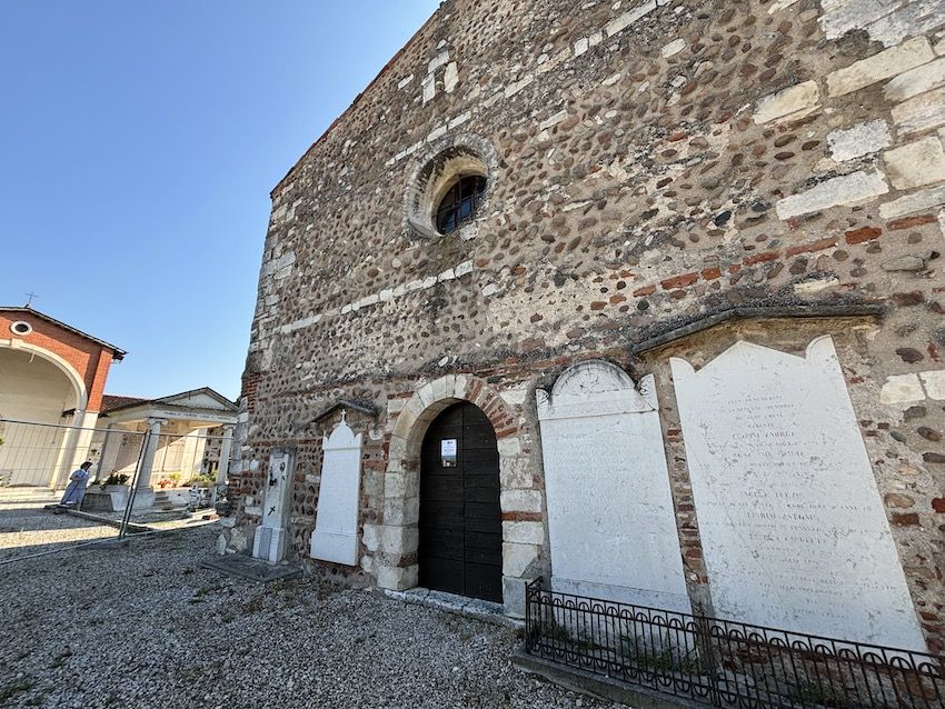 È il cimitero che serve i tremila abitanti di Palazzolo di Sona, ancora in uso. È meno piccolo di quelli visti finora, ma molto caratteristico. Le sepolture più antiche sorgono a ridosso della splendida pieve romanica di Santa Giustina, sull’omonimo colle. Uno scrigno di storia che si affaccia sulla pianura di Bussolengo: da qui sono passati Romani, Longobardi, Scaligeri e, venendo a tempi più recenti, i Savoia durante la Prima Guerra d’indipendenza.