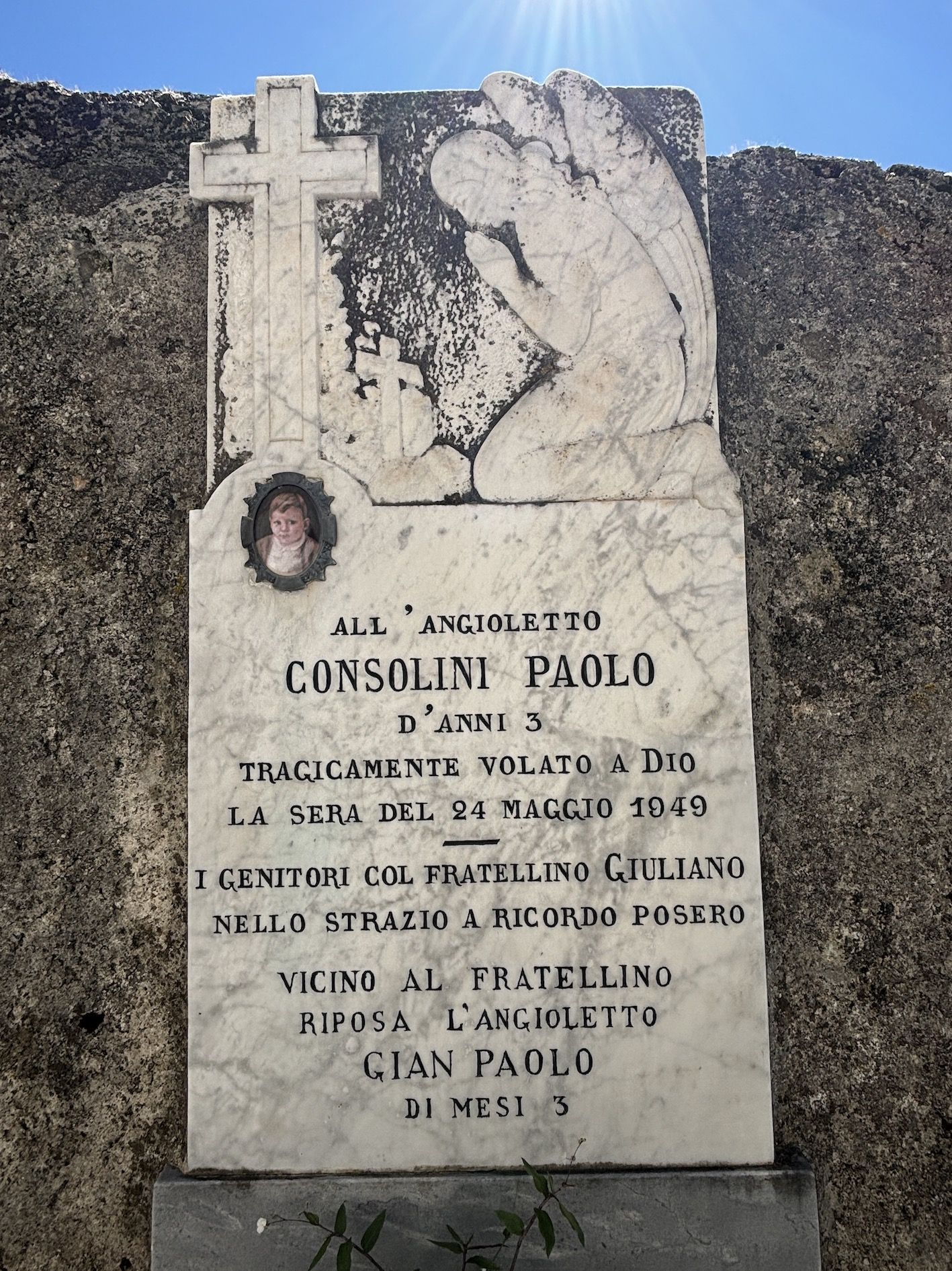 Ai bambini è dedicata una parte del cimitero. A soli 4 anni, il 17 marzo 1930, moriva Teresina Battistoni, “che una triste fatalità rapiva all’amore dei suoi cari”. “Rapita” fu pure “l’anima innocentissima di Aloisi Edoardo”, alla tenera età di 8 anni, il 12 novembre 1919. In tempi in cui la mortalità infantile era alta, i genitori piangevano anche Roberto Bertanza, di 3 anni, e “gli angioletti” Renzina Bonetti (1938) e Selmino Bonetti (1947).