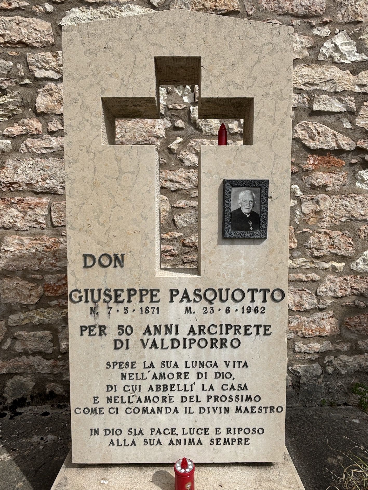 La sepoltura più illustre del piccolo cimitero di Valdiporro, frazione di Bosco Chiesanuova – senza nulla togliere alle altre – è quella di don Giuseppe Pasquotto (1871-1962). Per tutti: don Bepo, amatissimo parroco di questa piccola comunità lessinica di 500 anime (oggi 148). La sua tomba si trova a sinistra dell’ingresso, varcato il cancello in ferro di questo minuscolo camposanto immerso nei prati e nei boschi, da cui si ammira in lontananza il monte Purga di Velo Veronese.