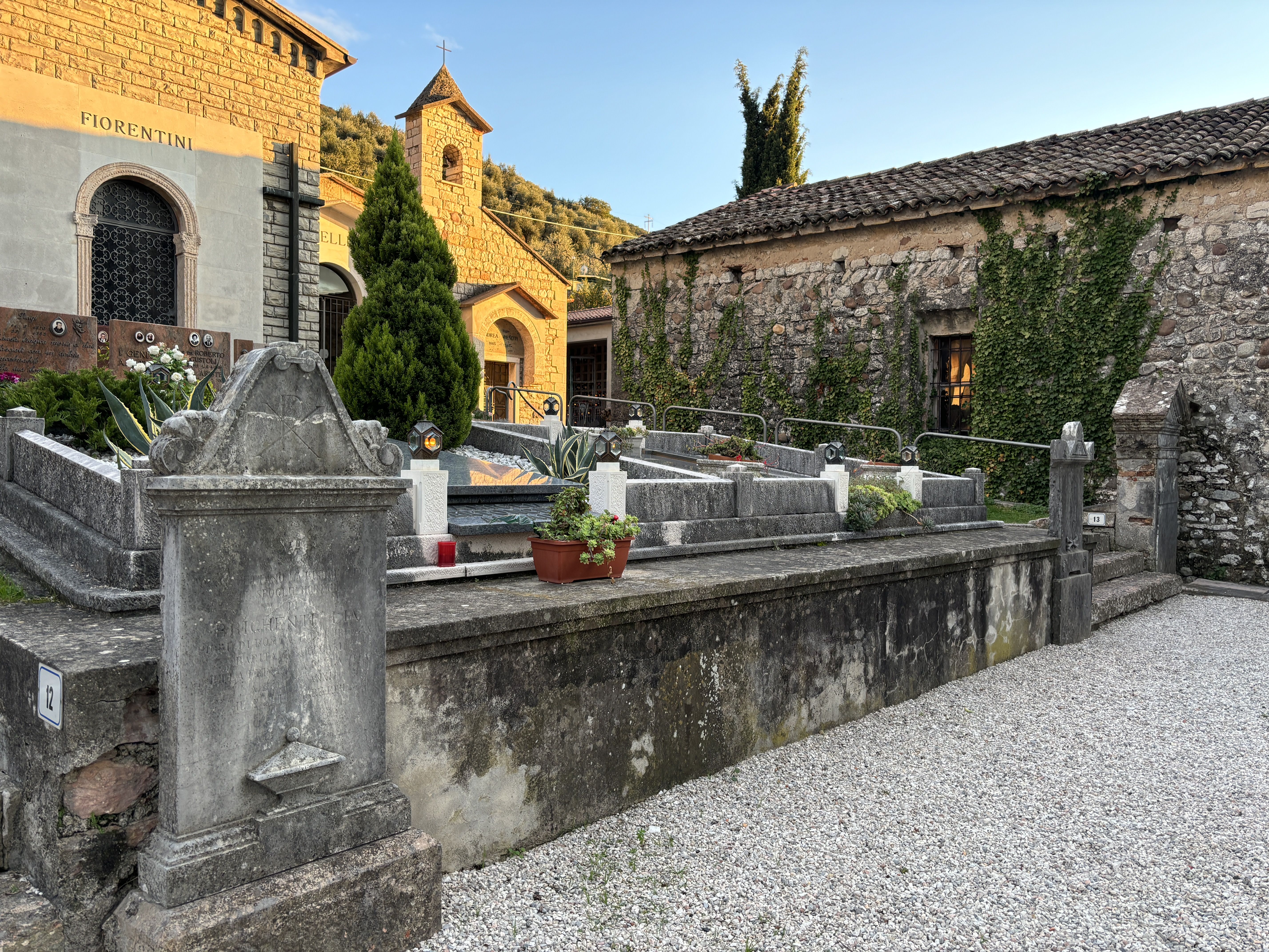 Molto rovinate e quasi illeggibili sono invece le sei lapidi sul muro a sud, fra cui una croce scritta in latino. Troviamo un altro bimbo in fasce, di cui rimane solo la foto; c’è un padre di famiglia, ricordato dalla moglie Domenica Consolini, sepolta accanto, che godette invece di una lunga vecchiaia: “Morì qual visse santamente il dì 26 dicembre dell’anno 1885 novantesimo di sua età”. E, ancora, ci imbattiamo in una “fedele madre affettuosa rapita d’anni 29”, Angela Zamboni, e nei coniugi Francesca Maria Tomasini (morta nel 1903) e Giovanni Battista Veronesi (nel 1923). Infine, girando tra i vialetti, si scoprono anche delle tombe “nascoste”, come quella di Arturo Nascimbeni e Francesca Aloisi, coperti da una nuova lapide, posata ad appena una spanna di distanza dalla loro. Fuori, il lago fa sentire lo sciabordio delle sue acque e richiama l’attenzione: da qui la vista è un anticipo di Paradiso.